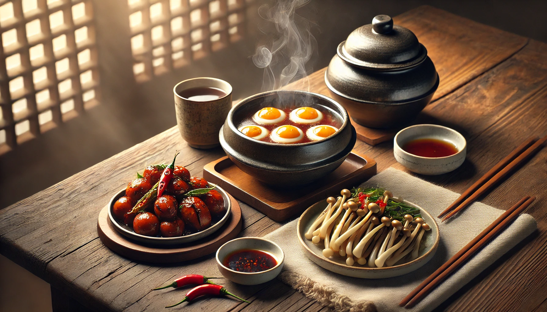 아침: 숭늉, 메추리알 장조림, 팽이버섯 볶음